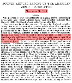 em 1910, no Livro do Ano do Comité Judaico Americano, é dito que os Russos desde 1890, têm um plano para expulsar ou exterminar 6 milhões de judeus por motivos religiosos