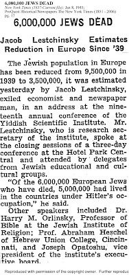 em 1945, mesmo antes do final da Guerra, outro judeu, Jacob Lestchinsky, já reclamava "seis milhões" de judeus mortos além de estimar uma redução da população judaica na Europa desde 1939 (e logo em "seis milhões")...