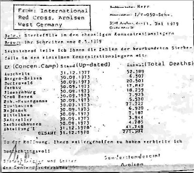 segundo dados da Cruz Vermelha, que inspeccionou os campos Nazis, o número aproximado de mortos nesses campos, foi inferior a 300 mil. e desses menos de 300 mil, nem todos eram judeus. talvez só metade o fossem. as principais causas de morte, foram fome e tifo.