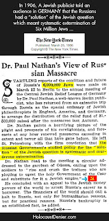 em 1906 um publicitário judeu diz no "New York Times" que os russos tencionavam exterminar 6 milhões de judeus ("solução"), em consequência da revolução bolchevique