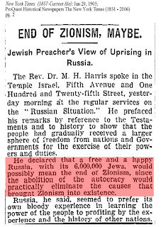 1905- Um pregador judeu declara que a abolição da autocracia russa (Czar) levada a cabo pelos judeus poderá significar o fim do sionismo, e nova referência a "seis milhões".