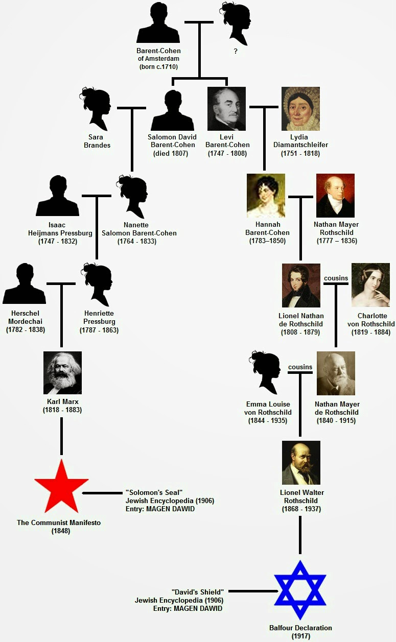 um dos familiares de 'Mordechai', chamado Lionel Walter Rothschild (1868-1937), esteve envolvido na Declaração de Balfour de 1917, sendo aliás, o seu destinatário, juntamente com o seu amigo próximo Chaim Weizmann, um dos líderes sionistas, juntamente com Ben-Gurion e Theodor Herzl (fundador oficial do sionismo). a teia parece complexa e enredada. mas, no fundo, todos eles eram amigos e próximos, quando não mesmo primos e familiares. marxismo é sionismo ou sionismo é marxismo. tanto faz. aqui fica a àrvore genealógica do judeu Mordechai (Marx):