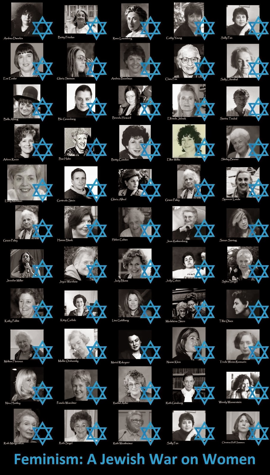 Andrea Dworkin, Betty Friedan, Rosa Luxemburg, Cathy Young, Sally Fox, Eve Ensler, Gloria Steinem, Andrea Bronfman, Clara Fox, Sally Lilienthal, Bella Abzug, Blu Greenberg, Brenda Howard, Elfriede Jelinek, Savina Teubal, Arlene Raven, Buz Hahn, Betty Comden, Ellen Willis, Shirley Broner, Emily Mehlman, Gertrude Stein, Gloria Allred, Grace Faley, Spencer Laszlo, Grace Faley, Hanne Blank, Helen Cohen, Jean Kothernberg, Susan Sontag, Jennifer Miller, Joyee Warshow, Judy Blume, Judy Cohen, Sylvia Siegel, Kathy Follitt, Kitty Carlisle, Lisa Goldberg, Madeleine Stern, Melton Florence, Mollie, Orshansky, Muriel Rukeyser, Naomi Klein, Trude Weiss-Rosmann, Nina Hartley, Pamela Waechter, Rachel Adler, Ruth Ginsburg, Wendy Wasserstein, Ruth Morgenthau, Ruth Segel, Ruth Westheimer, Sally Fox, Christina Hoff Summers